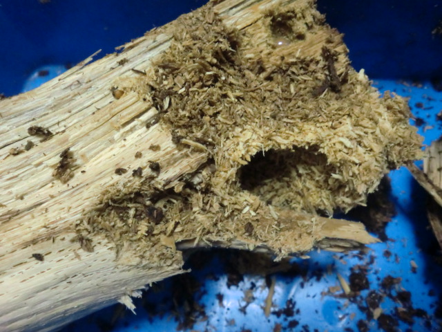 産卵方法は国産とあまり変わらずかなと感じましたが、 写真のように木を削りため込ながらの産卵でした。 ちょっとニジイロクワガタやタランドゥスの産卵に似ているように感じました。