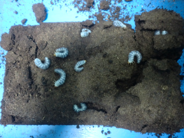 全部で14頭取れました。 WDで仕入れ♂が★になり、♀のみ生き残った為、交尾済みを願ってセット! 幼虫が取れひと安心! これから、気温が高くなるので、成長は早いかと思います。 ♀は2カ月後ぐらいで成虫になりそうな? ♂は低温で12月頃羽化すれば、そこそこ大きくなるかなと考えています!! 果たしてどうなるか?判りませんが、こんな感じで飼育したいと思います。