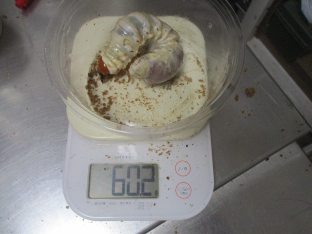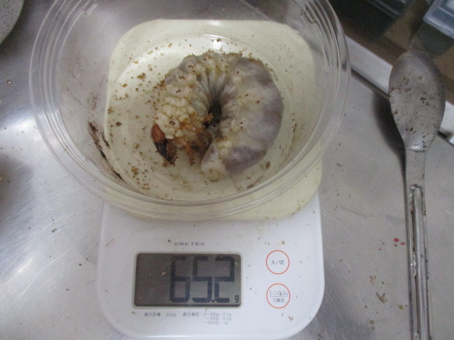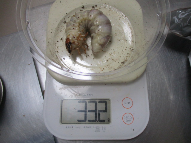 以前ルカディアカワラ菌床800cに入れて販売していました幼虫の1匹が♂で33.2gと順調に育っていました。流石ルカディア? ⇒ しかし、当店にはないので当店販売の1400ccカワラ菌床へ 80mmUPで羽化してくれるでしょうか?