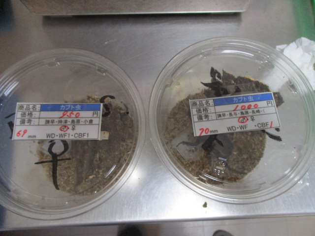 国産カブト虫 ♂70mm 1000円 ♂69mm 950円 ♀フリーサイズデ 600円